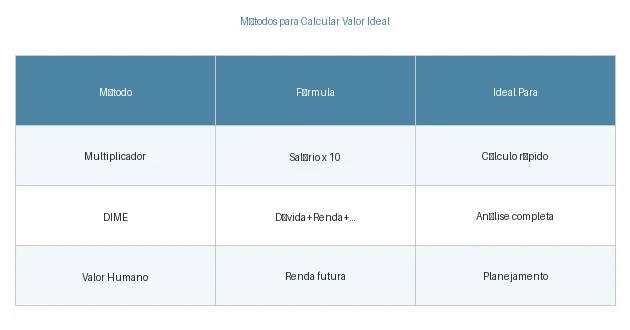 Por exemplo, se sua renda anual é de R$ 120.000, um capital segurado entre R$ 600.000 e R$ 1.200.000 seria um bom ponto de partida. Este método é ideal para um cálculo rápido, mas não considera dívidas ou objetivos específicos.